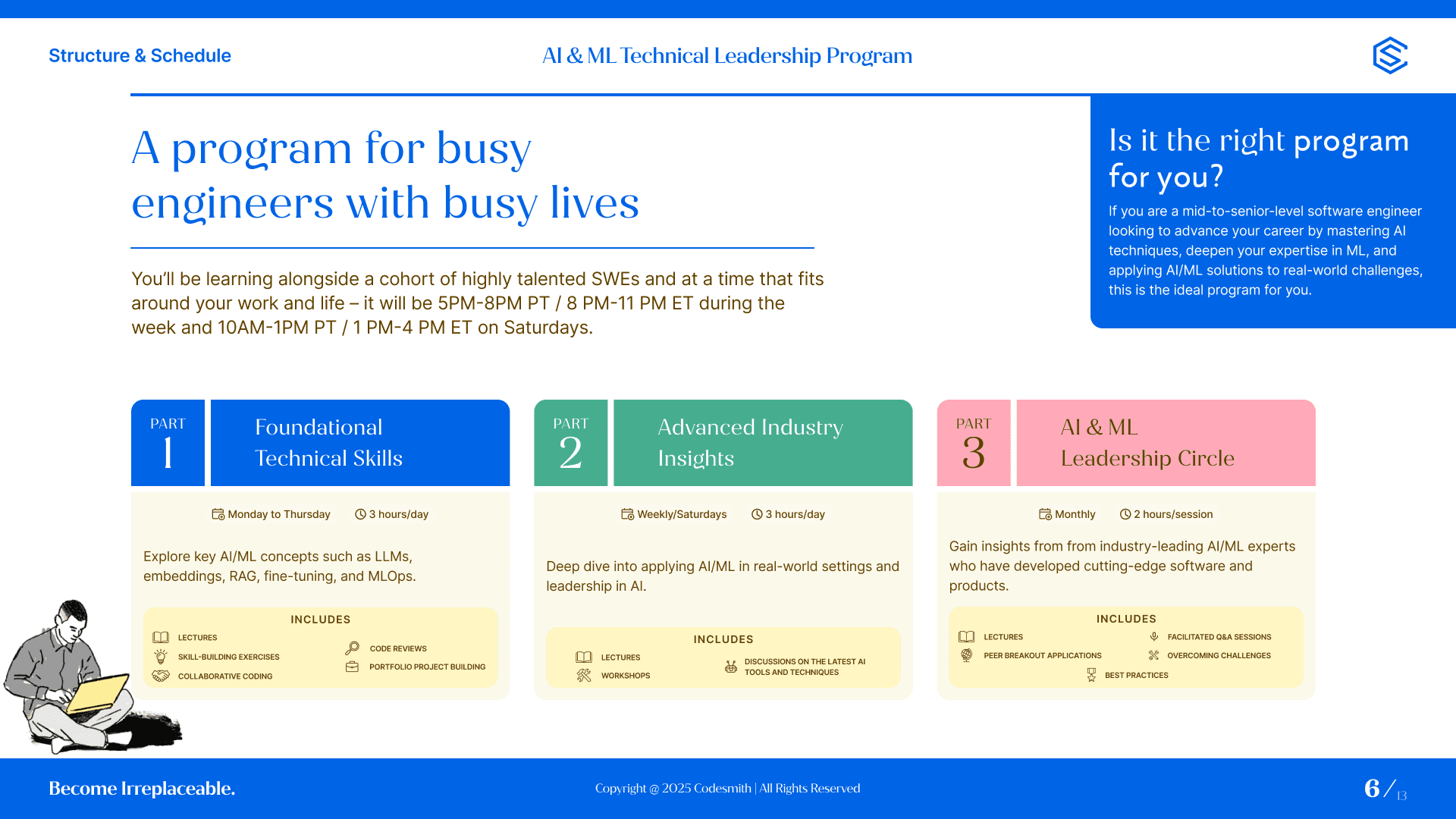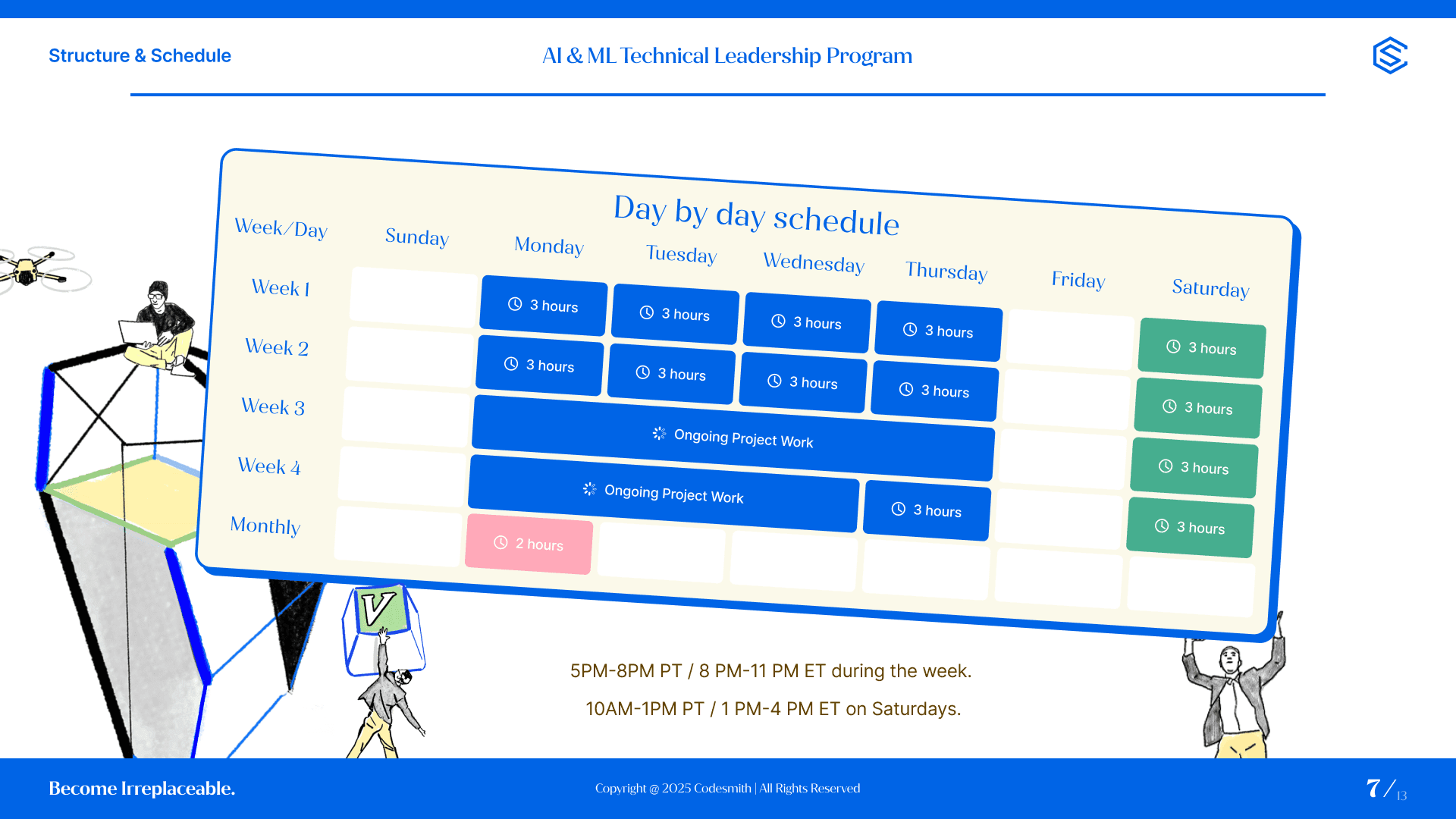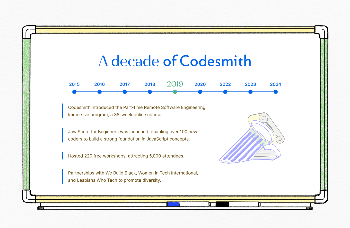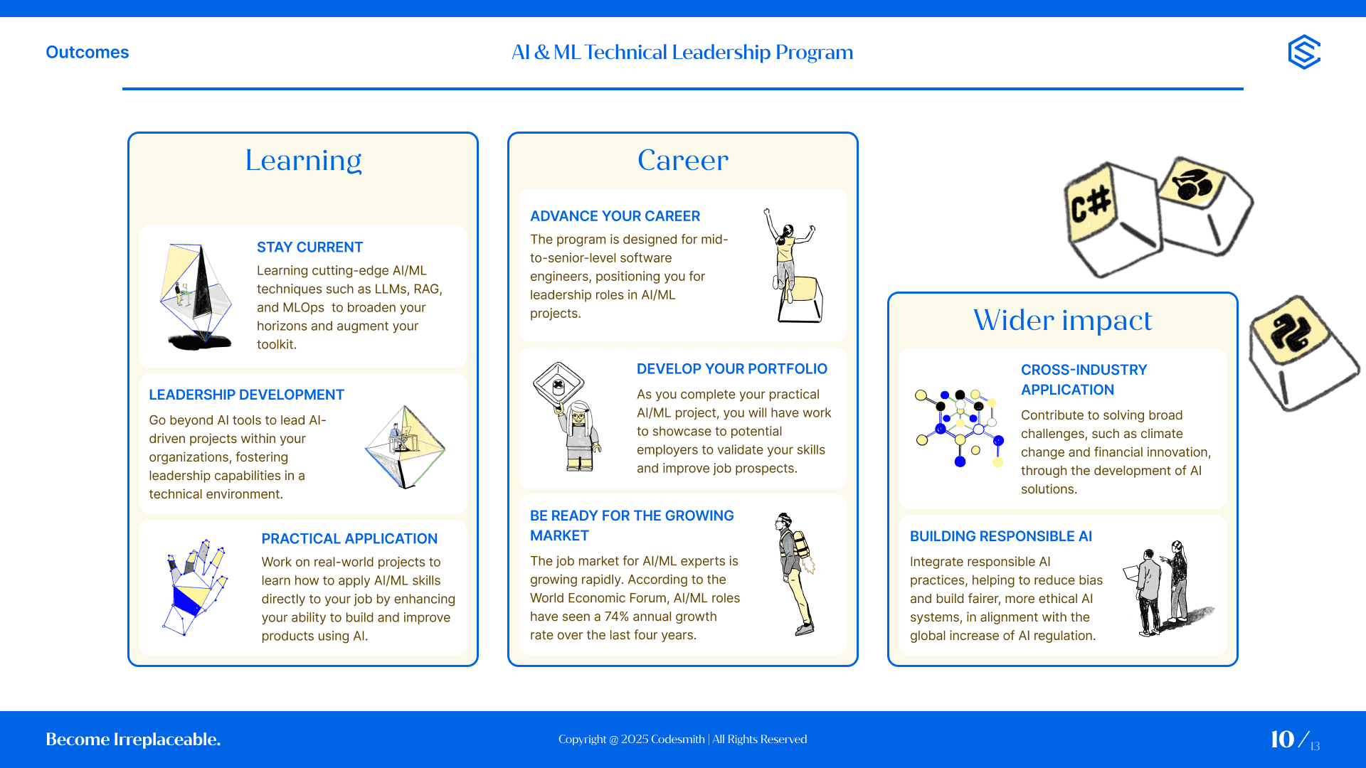 I joined Codesmith as a contractor right after they refreshed their brand identity, which introduced fresh colors, custom illustrations, and a bold retro-futuristic vibe across communication channels. My initial work was focused on creating slide decks, books, social media assets, flyers, and even their founder website.