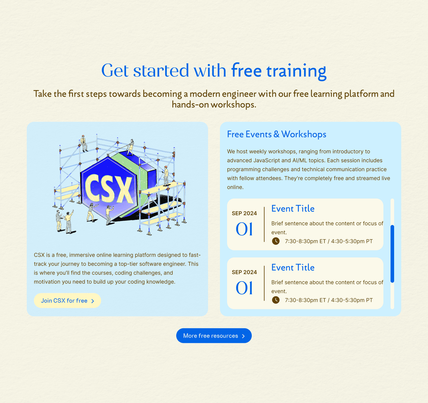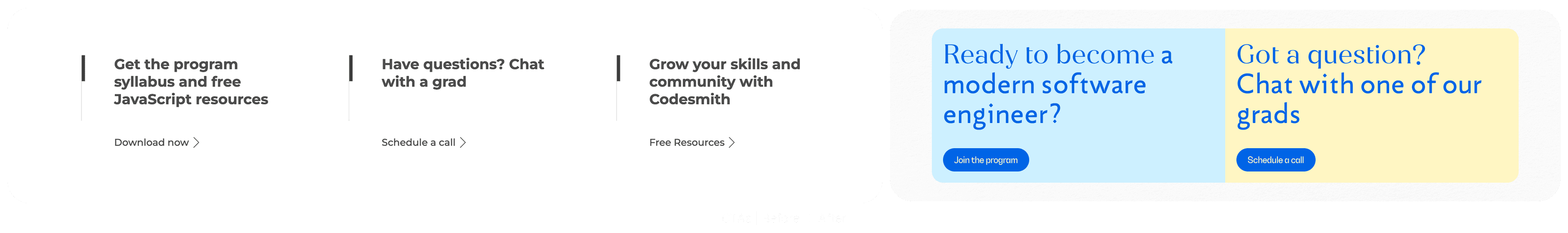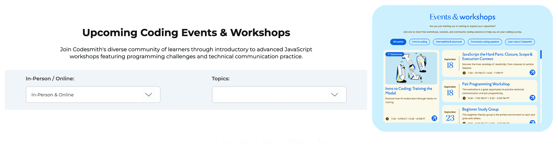 The old website felt static and corporate, disconnected from Codesmith’s warmth, community, and forward-thinking spirit. Students often struggled to find essentials like free resources, events, and clear information on programs. Instead of sparking curiosity about tech’s future, the site made navigation frustrating and left users uninspired.
