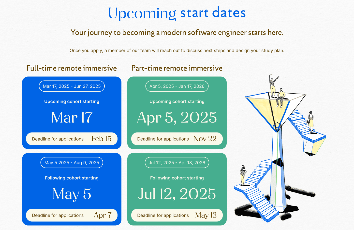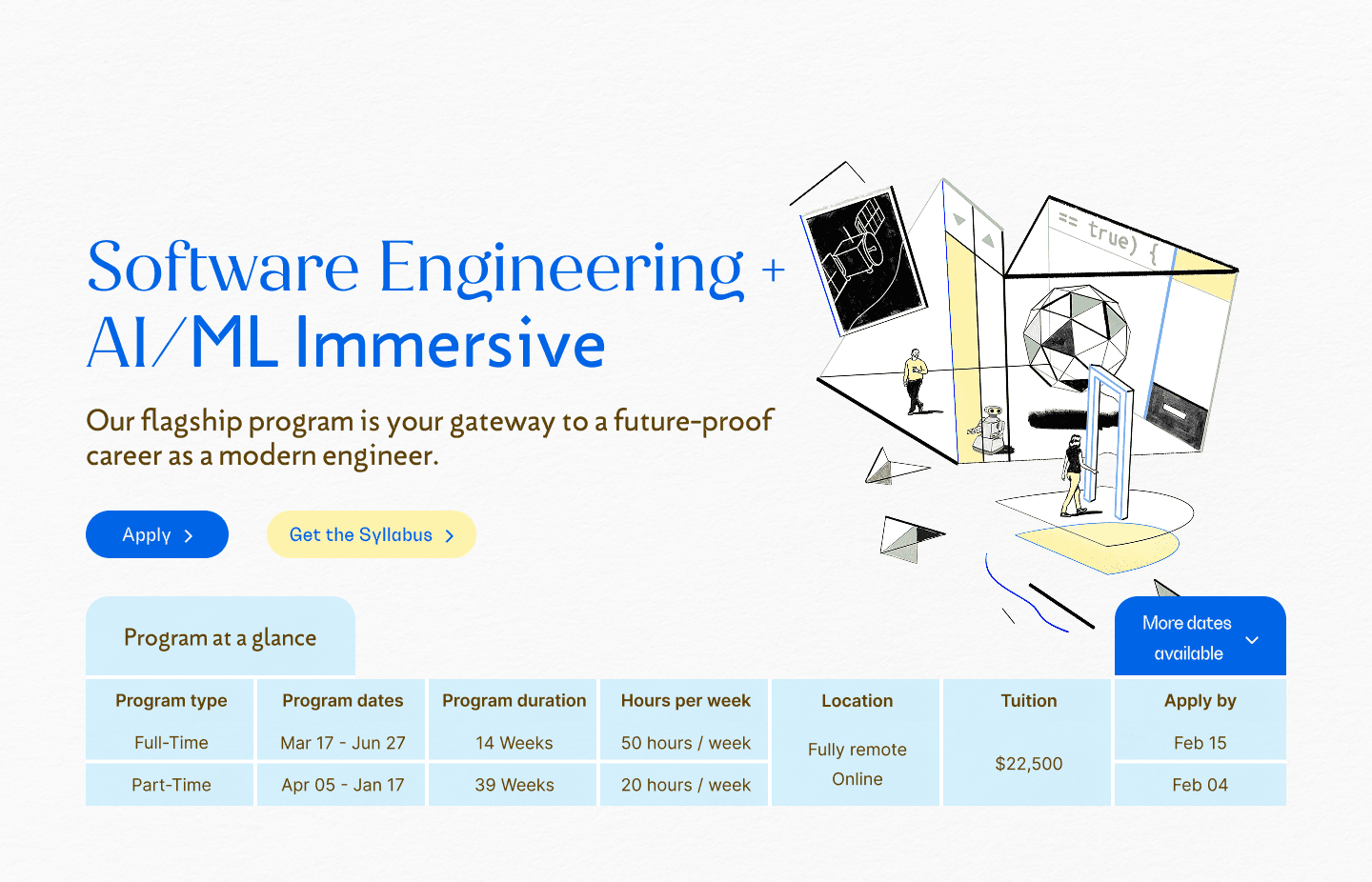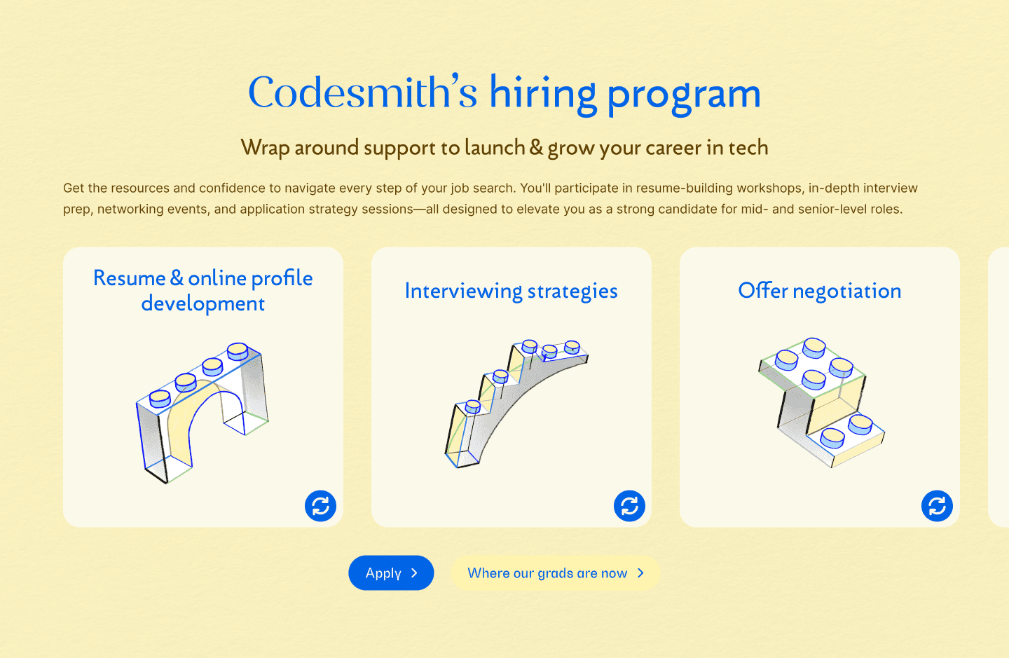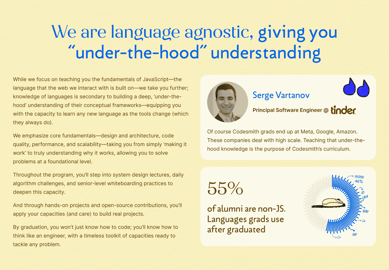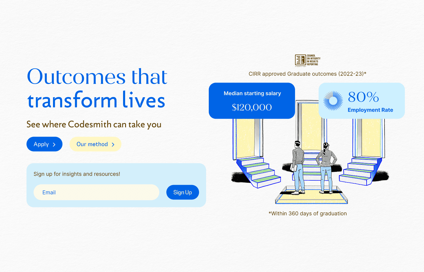 Redesign the website to feel approachable, modern, and student-centered, while keeping trust and outcomes front and center. The new experience also needed to reflect the voices of all stakeholders, including students, instructors, alumni, and staff. It had to highlight The Codesmith Method, a framework built on three pillars: timeless pedagogy, frontier tech, and curated community.