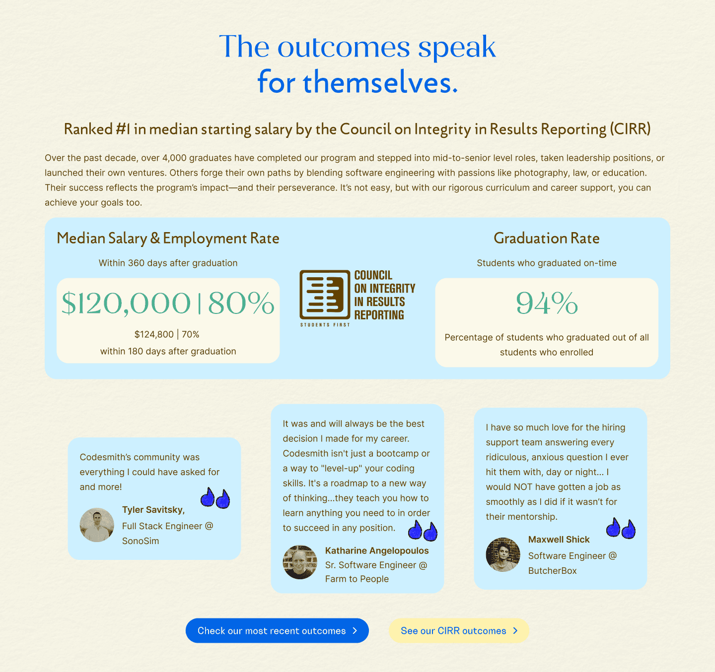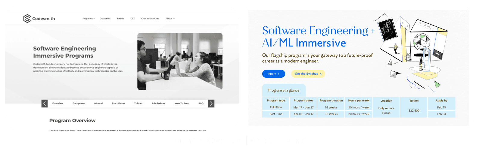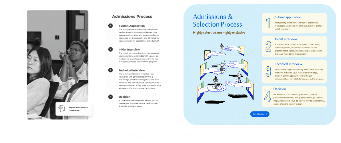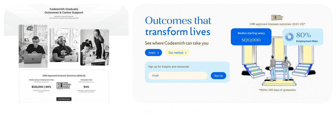 Codesmith is a leading software engineering bootcamp, but when I joined, its website felt outdated and overly corporate. It highlighted career outcomes, but it lacked warmth, personality, and storytelling. Most of all, it missed the chance to reflect the diverse community and the real experience inside the program.